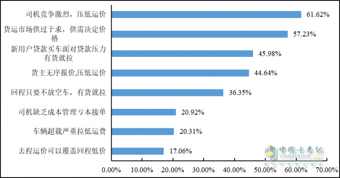 對于以低于成本價(jià)承運貨物的貨車(chē)司機調查顯示,主要原因仍然是行業(yè)競爭激烈、市場(chǎng)供過(guò)于求。調查顯示,61.62%的貨車(chē)司機認為司機競爭激烈,壓低運價(jià);57.23%的貨車(chē)司機認為是貨運市場(chǎng)供過(guò)于求,供需決定價(jià)格。同時(shí),45.98%的貨車(chē)司機認為部分新手司機貸款買(mǎi)車(chē)面臨車(chē)貸壓力,只要能支付貸款有貨就拉,從而壓低運價(jià)。還有44.64% 的司機認為貨主無(wú)序報價(jià),壓低運價(jià)??傮w來(lái)看,車(chē)多貨少、供過(guò)于求、無(wú)法退出是運價(jià)低于成本價(jià)的主要原因。