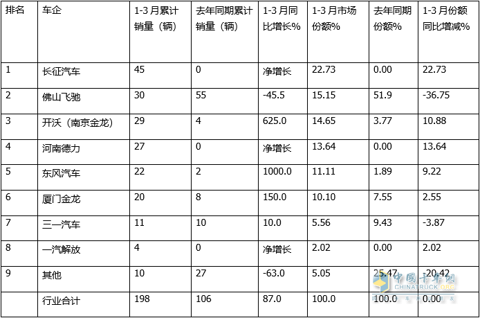 特點(diǎn)三:一季度累銷(xiāo)中,長(cháng)征汽車(chē)、佛山飛馳、開(kāi)沃(南京金龍)居前三;市場(chǎng)份額同比增加最多的是長(cháng)征汽車(chē)
