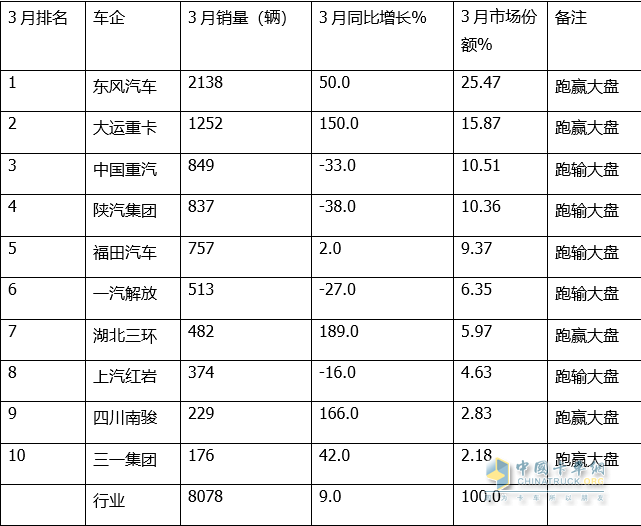 總之,無(wú)論是今年3月還是一季度,重型自卸車(chē)同比增速均跑輸重卡大盤(pán)。