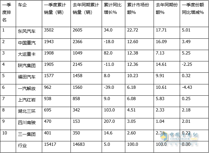 特點(diǎn)四、一季度累銷(xiāo)東風(fēng)、重汽、大運居前三;TOP10同比7增3降,南駿領(lǐng)漲;市場(chǎng)份額同比8增2減,大運份額增加最多