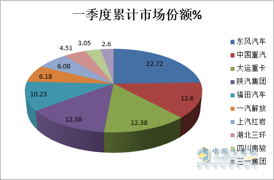 1、2023年一季度重型自卸車(chē)累計銷(xiāo)量及占比: