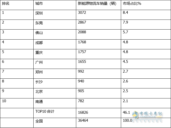 上表顯示,今年一季度新能源物流車(chē)流向top10城市: