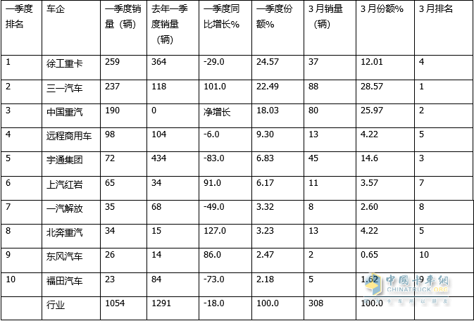 特征三、一季度徐工、三一、重汽居前三;3月三一奪冠