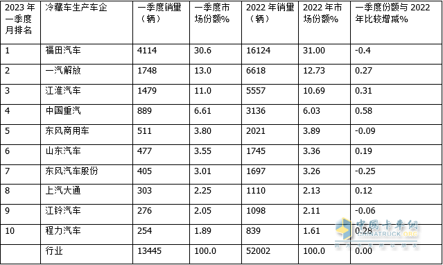值得一提的是,今年一季度冷藏車(chē)銷(xiāo)量TOP10排名與2022年完全相同,說(shuō)明目前冷藏車(chē)市場(chǎng)競爭格局基本穩定。