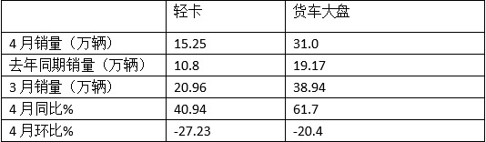 一是因為去年同期受疫情影響嚴重,而輕卡作為城配物流市場(chǎng)的主要服務(wù)工具受到的影響相對其他卡車(chē)細分市場(chǎng)較小,因此銷(xiāo)量基數相對較高,給今年4月的同比增長(cháng)帶來(lái)壓力;