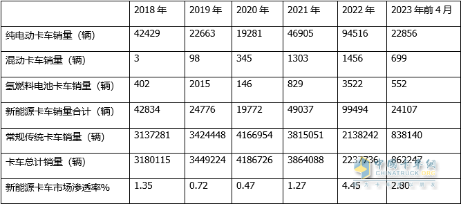 表1,根據截圖1數據,2023年前4月及近年新能源卡車(chē)市場(chǎng)滲透率統計如下: