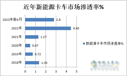 2023年1-4月新能源卡車(chē)市場(chǎng)滲透率為2.8%,在近6年中居第二,處于中上水平,但比2022年的4.45%要低1.65個(gè)百分點(diǎn)。