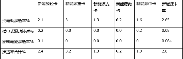 ---新能源輕卡市場(chǎng)滲透率為2.4%(純電動(dòng)車(chē)型貢獻2.1%,插電式混動(dòng)車(chē)型貢獻0.2%,燃料電池車(chē)型貢獻0.1%),居新能源卡車(chē)行業(yè)第三,但低于能源卡車(chē)平均2.8%的市場(chǎng)滲透率0.4個(gè)百分點(diǎn)。