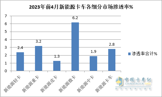 上圖表顯示,2023年前4月新能源卡車(chē)各細分市場(chǎng)的滲透率: