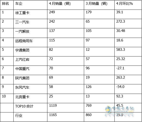 三、4月徐工、三一、解放居前三;環(huán)比宇通領(lǐng)漲