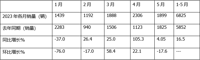 三是去年同期銷(xiāo)量基數較高(1825輛),給今年5月同比增長(cháng)帶來(lái)壓力。