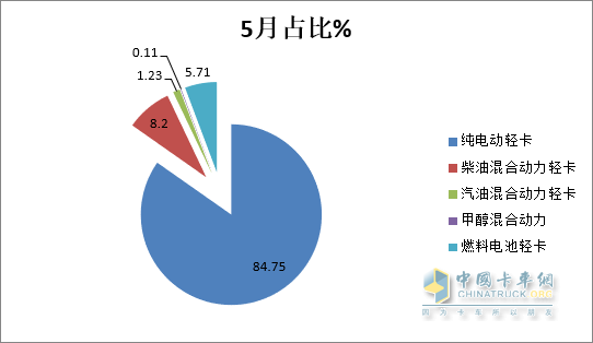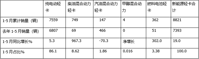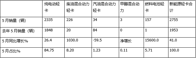 上圖表可見(jiàn),在今年5月新能源輕卡各類(lèi)車(chē)型銷(xiāo)量同比及占比中: