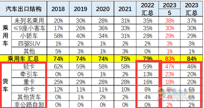 總之,不論是今年5月還是1-5月,輕卡出口占比均領(lǐng)跑貨車(chē)出口大盤(pán);而牽引車(chē)均居第二,且1-5月占比與2022年比較增加最多,是貨車(chē)出口市場(chǎng)中增長(cháng)最猛的細分車(chē)型。