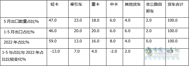 表2,根據中國汽車(chē)流通協(xié)會(huì )數據(截圖2),2023年5月及1-5月貨車(chē)各細分市場(chǎng)出口數量及占比、2023年1-5月占比與2022年占比比較:
