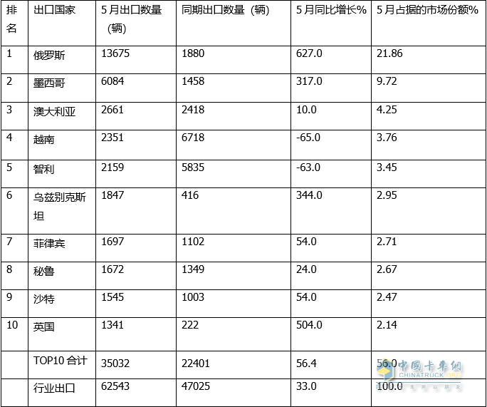 上圖表可見(jiàn),在2023年5月卡車(chē)出口的TOP10國家中,呈現以下特征:
