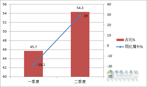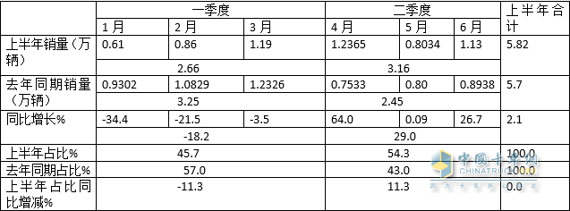 特點(diǎn)一、月度銷(xiāo)量同比依次演繹“3連降”和“3連漲”;二季度成為推動(dòng)上半年中卡市場(chǎng)增長(cháng)的主要貢獻者