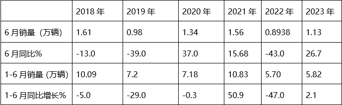 2023年6月中卡銷(xiāo)量為1.13萬(wàn)輛,在近6年6月中居第四(同比降幅26.7%),居于較低水平;
