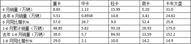 在今年6月貨車(chē)四大細分市場(chǎng)銷(xiāo)量同比中,中卡銷(xiāo)量同比增長(cháng)26.7%,居貨車(chē)四大細分市場(chǎng)中第三,跑贏(yíng)6月貨車(chē)大盤(pán);