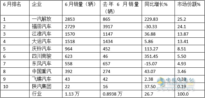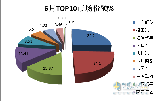 特點(diǎn)四:6月解放第一;福田與江淮分別居第二、第三;TOP10同比8增2降,南駿領(lǐng)漲