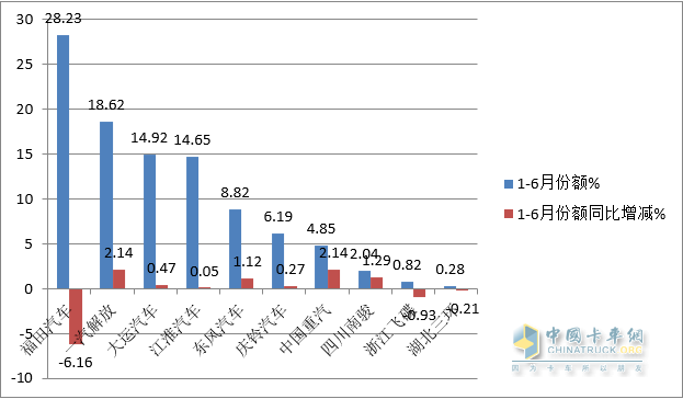 特點(diǎn)五:1-6月:福田霸榜;解放、大運分別居亞軍和季軍;top10同比7增3降;份額同比7增3減,解放、重汽增加最多表現搶眼。