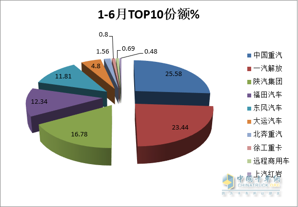 特點(diǎn)五:1-6月重汽、解放、陜汽居前三;6月解放、重汽、陜汽居前三