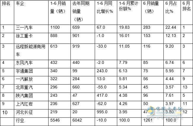 ---三一汽車(chē)累計銷(xiāo)1100輛,同比增長(cháng)67%,跑贏(yíng)大盤(pán),市場(chǎng)占比19.83%,奪得銷(xiāo)量冠軍;