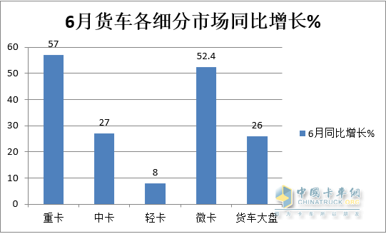 --- 2023年6月輕卡銷(xiāo)量15.99萬(wàn)輛(開(kāi)票數據,非終端銷(xiāo)量),同比增長(cháng)8%(也是在去年同期銷(xiāo)量處于歷史最低位基礎上的同比增速),跑輸2023年6月貨車(chē)大盤(pán)31%的同比增速近23個(gè)百分點(diǎn),也低于今年6月貨車(chē)大盤(pán)中的其他三個(gè)細分市場(chǎng)的同比增速(2023年6月重卡、中卡、微卡同比增速分別為57%、27%和52.4%,見(jiàn)表2和圖3)。