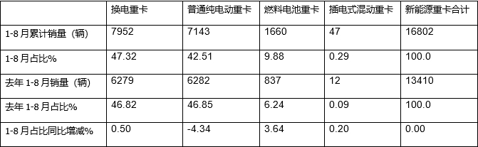 特點(diǎn)三:1-8月燃料電池重卡占比同比增加最多