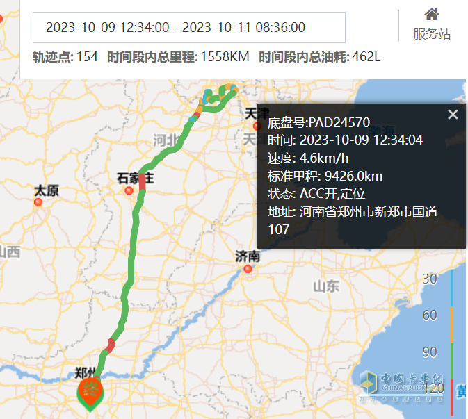 本次去程:鄭州至北京路線(xiàn),車(chē)貨總重49.6噸, 返程北京至鄭州路線(xiàn),車(chē)貨總重49噸。往返總里程1558公里,總油耗462升,往返平均油耗29.65升/百公里。
