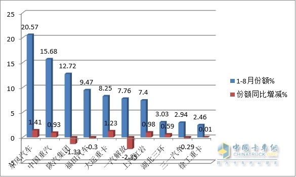 四、1-8月累銷(xiāo):東風(fēng)、重汽、陜汽居前三;TOP10市場(chǎng)份額同比6增4降,東風(fēng)增加最多