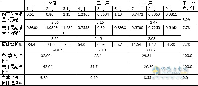 按季度劃分,今年前三季度中的一季度中卡累計銷(xiāo)量為2.66萬(wàn)輛,同比下降18.2%,跑輸今年前三季度中卡大盤(pán)7.23%的增幅,且占據今年前三季度中卡總銷(xiāo)量32.09%的份額,居于第二;而今年第二季度中卡累計銷(xiāo)售3.16萬(wàn)輛。同比增長(cháng)29%,跑贏(yíng)且領(lǐng)漲今年前三季度中卡大盤(pán)7.23%的增幅。且占據今年前三季度中卡總銷(xiāo)量38.1%的份額,居于主體地位;今年第三季度中卡累計銷(xiāo)售2.47萬(wàn)輛,同比增長(cháng)21.67%,跑贏(yíng)今年前三季度中卡大盤(pán)7.23%的增幅,占據今年前三季度中卡總銷(xiāo)量29.81%的份額,居第三。從各個(gè)季度的銷(xiāo)量占比同比增減看,第二季度占比同比增加了6.4個(gè)百分點(diǎn),是占比同比增加最多的季度。