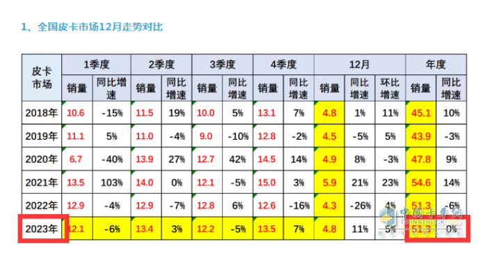總之,2023年12月和1-12月皮卡銷(xiāo)量均居近5年同期中等水平。