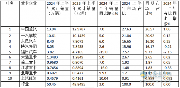 表3,2024年上半年重卡TOP10車(chē)企累計銷(xiāo)量、同比、市場(chǎng)占比及占比同比增減(數據來(lái)源:中汽協(xié)及公開(kāi)數據)