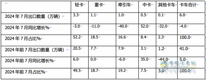 表3,2024年7月及1-7月各動(dòng)力貨車(chē)出口及同比、占比統計(數據來(lái)源:截圖1)