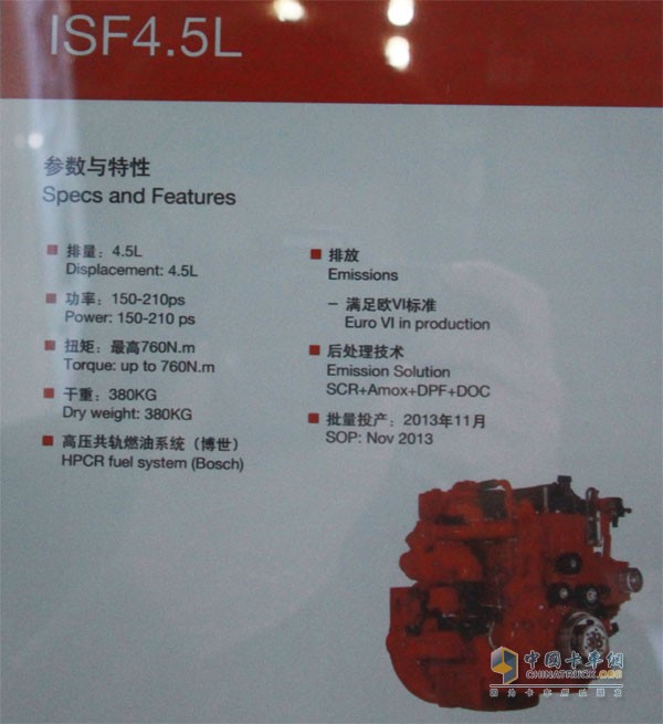 功率覆蓋150-210馬力,最大扭矩可達760N?m,其動(dòng)力性和經(jīng)濟性與國內同馬力段競品相比均具有很大的優(yōu)勢。最重要的是ISF4 5L是一款完全滿(mǎn)足歐六標準的發(fā)動(dòng)機,其后處理系統采用DOC+DPF+SCR的集成系統,可將顆粒物及氮氧化物同時(shí)進(jìn)行有效處理,進(jìn)而達到歐六的排放標準,據了解該發(fā)動(dòng)機在2013年7月就已經(jīng)批量投產(chǎn),并熱銷(xiāo)海外,可以說(shuō)是一款集創(chuàng )新與科技于一身的一款世界級的發(fā)動(dòng)機。